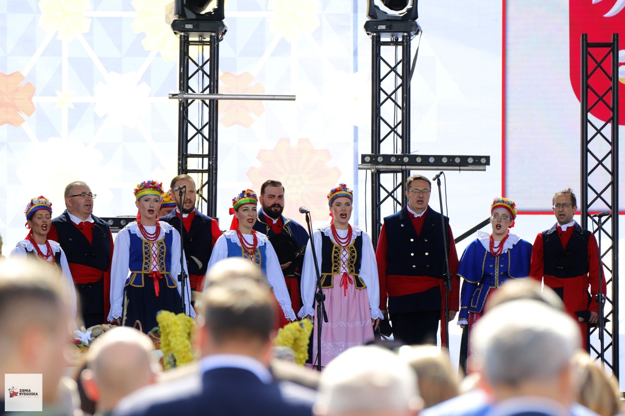 W tym roku Dożynki Wojewódzkie odbyły się w bydgoskim Myślęciunku. Ziemia Bydgoska była obecna zarówno podczas części oficjalnej jak i w części artystycznej. Wraz z kwintetem dętym z Filharmonii Pomorskiej w Bydgoszzy wykonaliśmy Hymn Polski oraz Rotę. Podczas dzielenia się chlebem z uczestnikami Dożynek śpiewaliśmy tradycyjną pieśń "Plon niesiemy, plon".