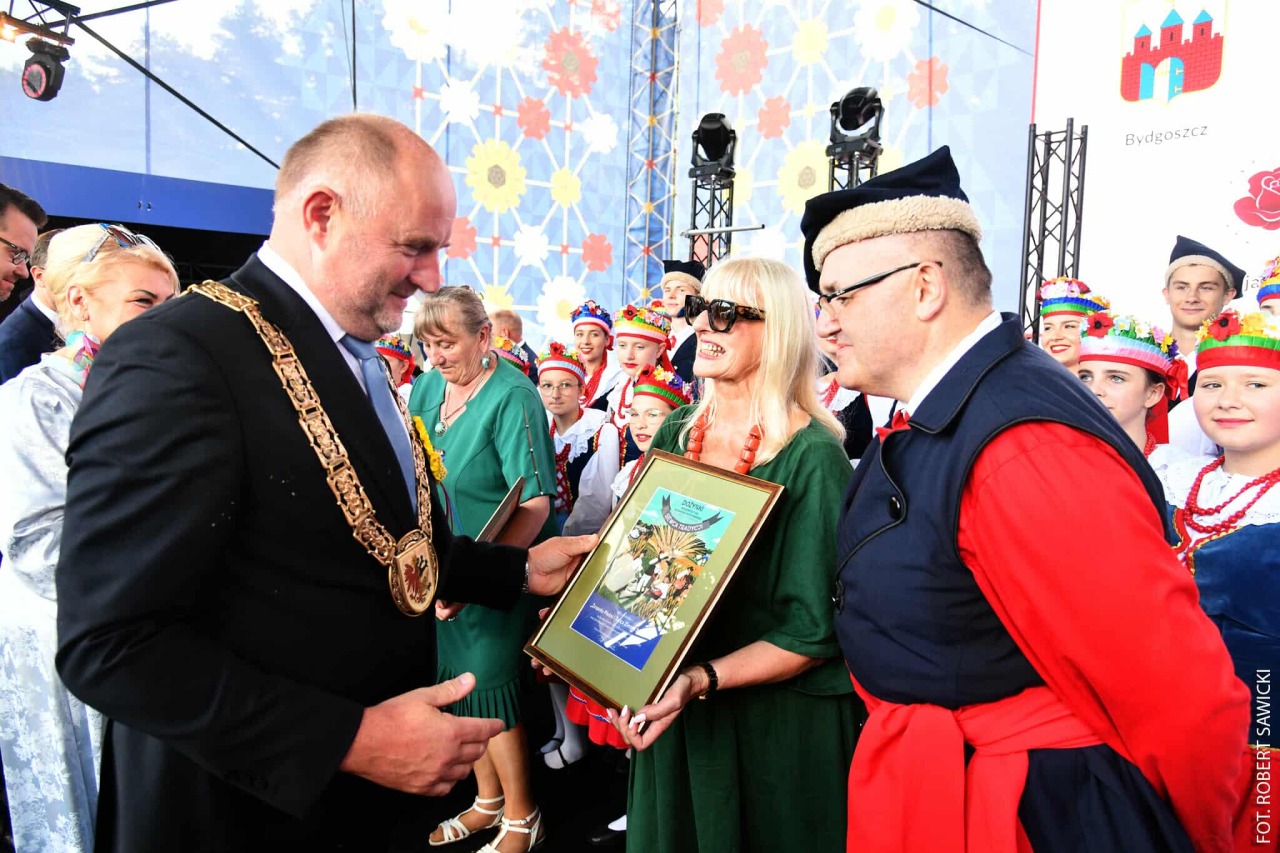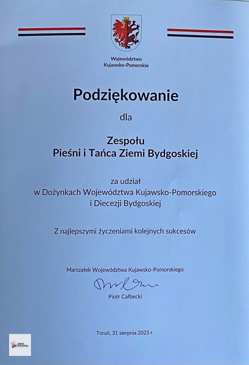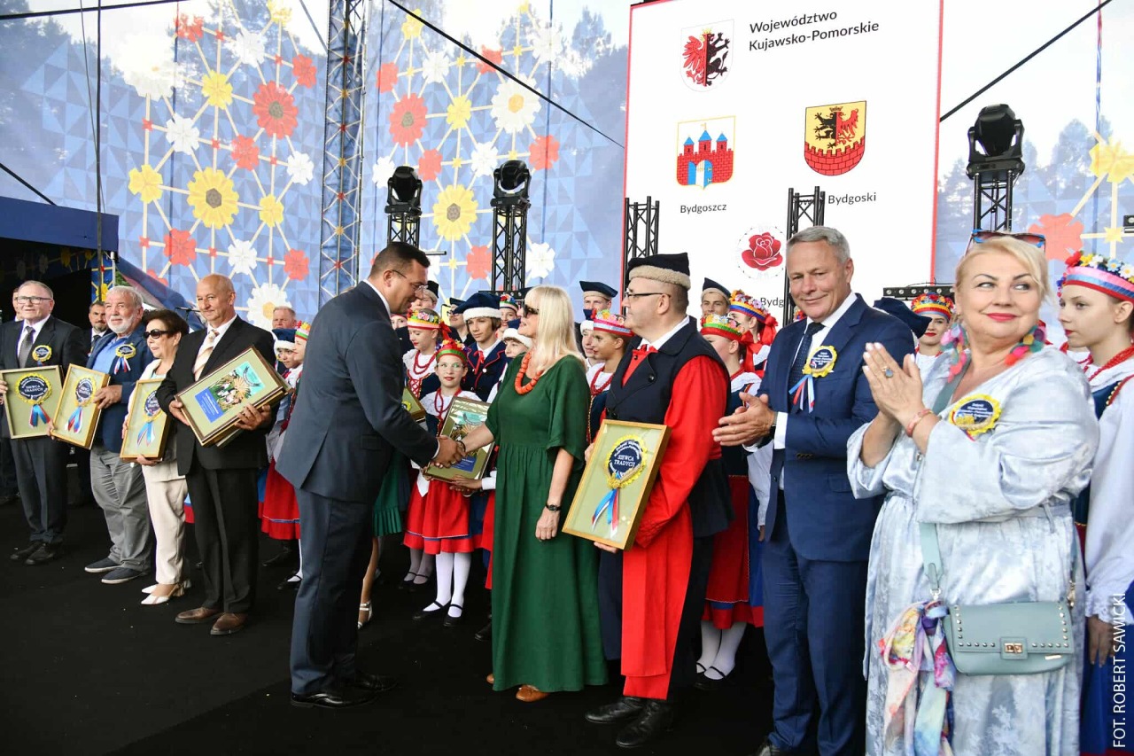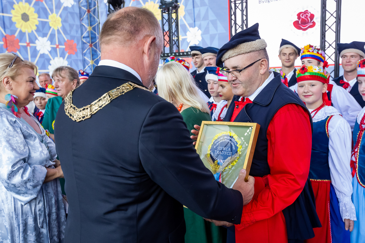 Podczas niniejszych dożynek otrzymaliśmy niezwykle prestiżową i ważną dla nas nagrodę z rąk Marszałka Województwa Kujawsko-Pomorskiego, Pana Piotra Całbeckiego - Siewca Tradycji. To docenienie naszego zaangażowania w wielopokoleniową i międzynarodową działalność na rzecz promowania i kultywowania polskiego folkloru.