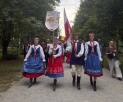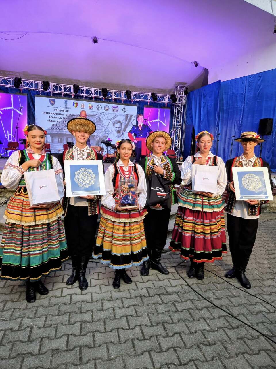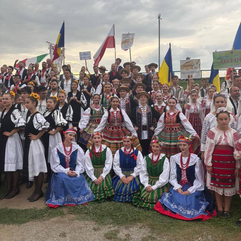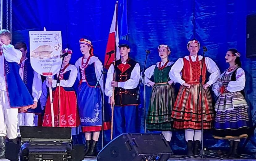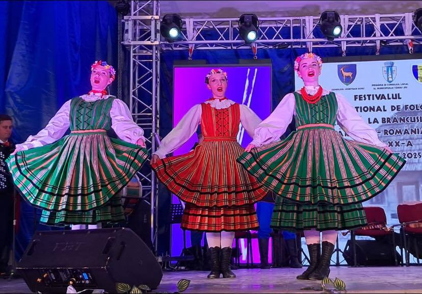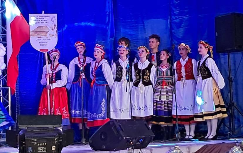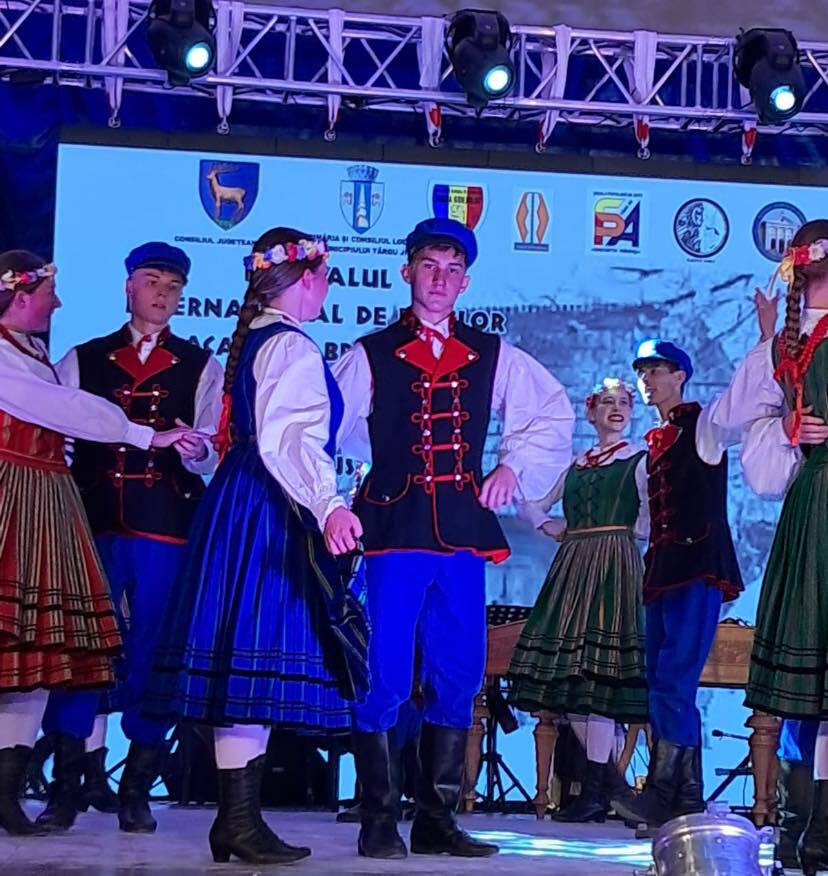 Nasza złota młodzież z flagą Polski dumnie nosi strój kujawski podczas Międzynarodowego Festiwalu Folklorystycznego ACASÂ LA BRÂNCUSI w Târgu Jiu w Rumunii.